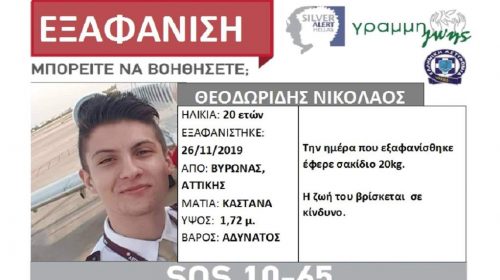 Από τις ελληνικές αρχές εκδόθηκε αναγγελία Silver Alert για τον 20χρονο, τα ίχνη του οποίου έχουν χαθεί χωρίς να υπάρχει το παραμικρό στοιχείο για το πού βρίσκεται.