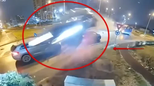 Η πορεία του αυτοκινήτου ήταν τρελή. Βγήκε εκτός δρόμου, χτύπησε σε ράμπα και εκτινάχθηκε στον αέρα. Το πιο απίστευτο; Η «ιπτάμενη» Mercedes πέρασε πάνω από δύο άλλα σταθμευμένα οχήματα πριν προσγειωθεί ξανά –ανώμαλα– στο οδόστρωμα.