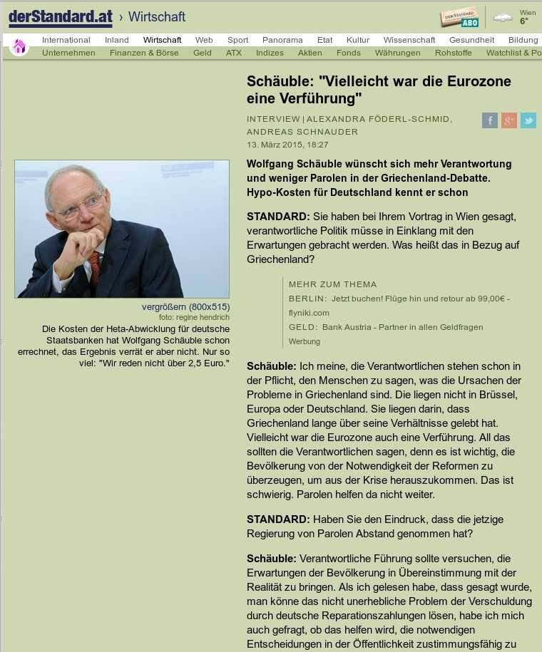 Συνέντευξη στην αυστριακή Der Standard έδωσε ο Βόλφγκανγκ Σόιμπλε μιλώντας για το ελληνικό ζήτημα του χρέους, τις γερμανικές αποζημιώσεις και ένα τρίτο πρόγραμμα.