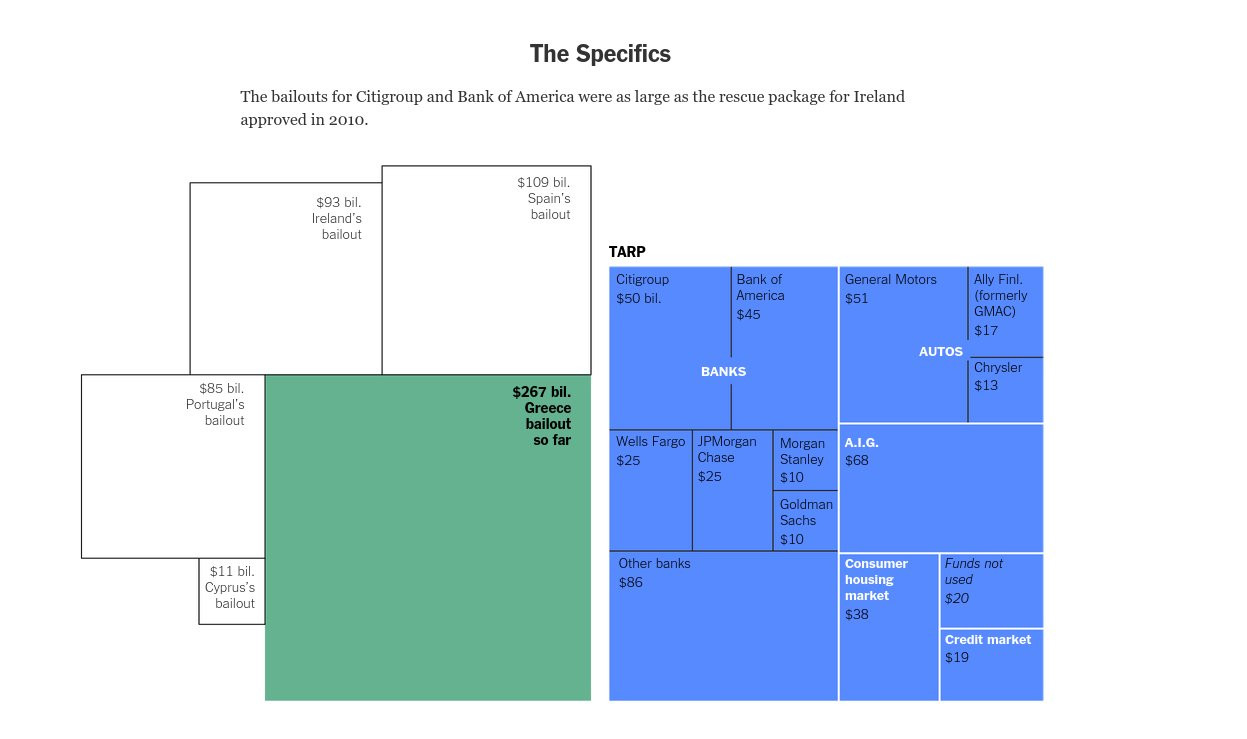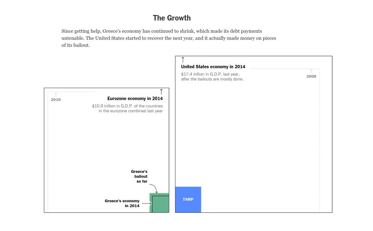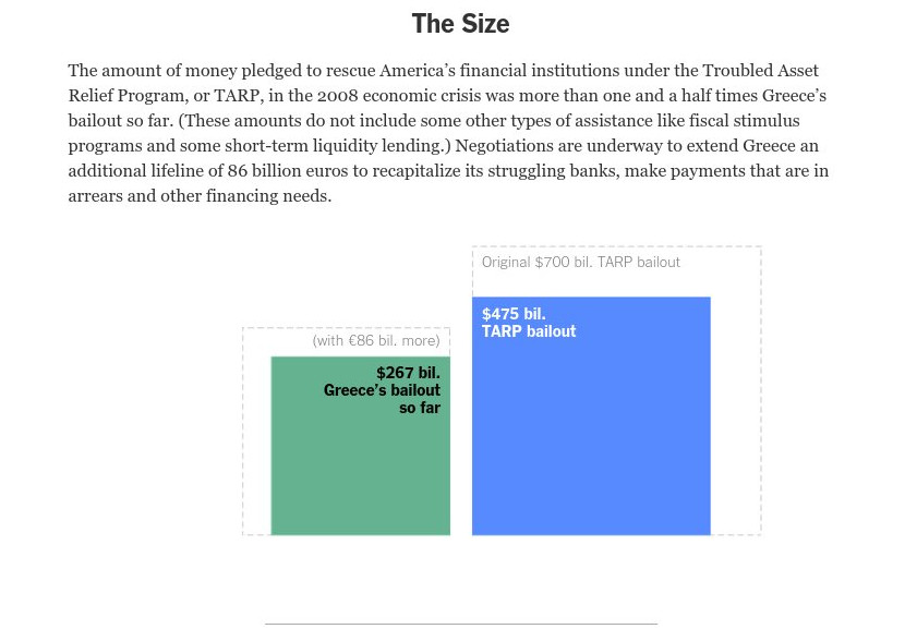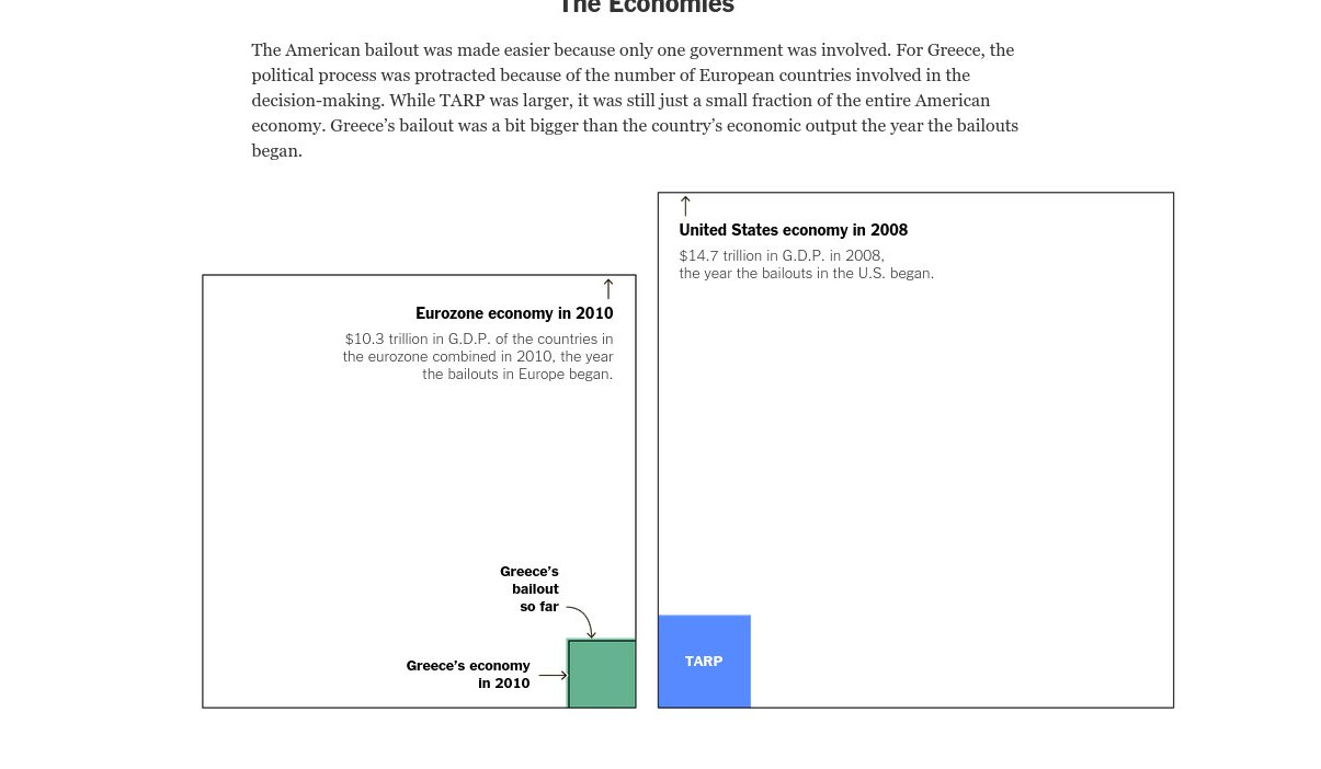Το άρθρο σημειώνει ότι η αμερικανική διάσωση ήταν πιο εύκολη για τον απλούστατο λόγο ότι ασχολήθηκε με αυτήν μόνο μια κυβέρνηση. Σε αντίθεση με την περίπτωση της Ελλάδα όπου ενεπλάκησαν μια σειρά κρατών και οργανισμών που κάθε μια (και κάθε ένας) είχε διαφορετικές στοχεύσεις και σχέδια. Μπορεί το πρόγραμμα TARP να ήταν μεγαλύτερο σε μέγεθος, ωστόσο σε σχέση με τη συνολική οικονομία των ΗΠΑ, αποτέλεσε ένα μικρό μέρος. Το πρόγραμμα της Ελλάδας, με αυτό το κριτήριο, είναι μεγαλύτερο από το μέγεθος της οικονομίας. Κάτι που συνέβη από το πρώτο κιόλας πρόγραμμα.