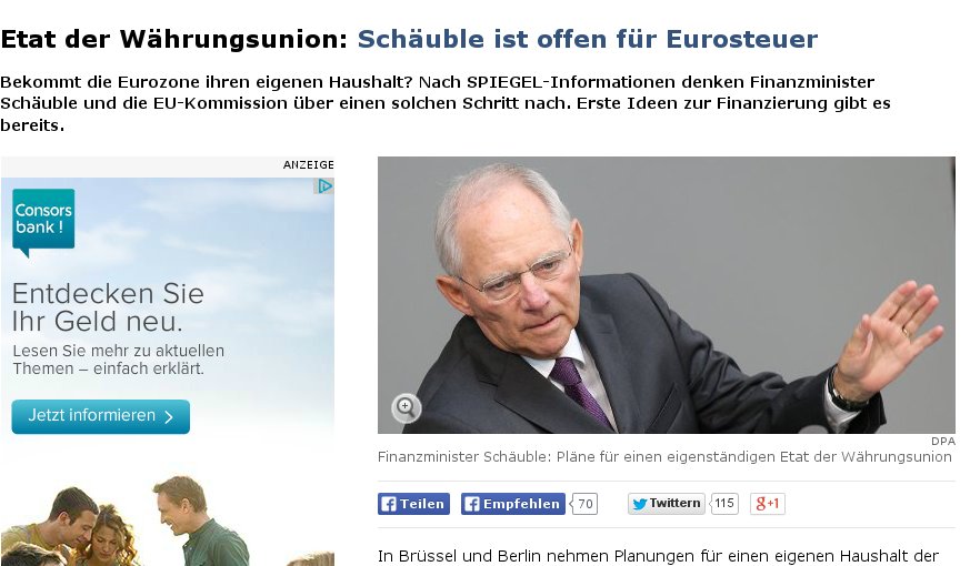 Σύμφωνα με δημοσίευμα του Spiegel, ο Βόλφγκανγκ Σόιμπλε και η Κομισιόν συζητούν για την υιοθέτηση προϋπολογισμού της ευρωζώνης και ήδη γίνονται σκέψεις για τη χρηματοδότησή του. Πρόκειται για ένα φόρο που θα σχετίζεται με το εισόδημα, ή θα συνδέεται με τις πωλήσεις αγαθών, όπως γράφει το γερμανικό περιοδικό στη διαδικτυακή του έκδοση.