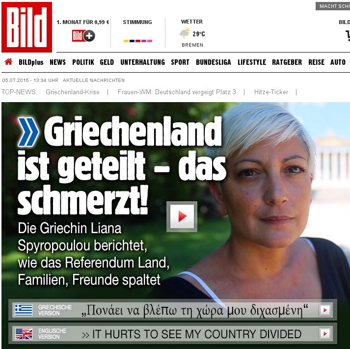 Το πρώτο θέμα στην ιστοσελίδα της γερμανικής εφημερίδας είναι γραμμένο τόσο στα ελληνικά όσο και στα γερμανικά. Πρόκειται για μία προσωπική μαρτυρία της Λιάνας Σπυροπούλου, της Ελληνίδας δημοσιογράφου που συνεργάζεται με την Bild από το 2014.