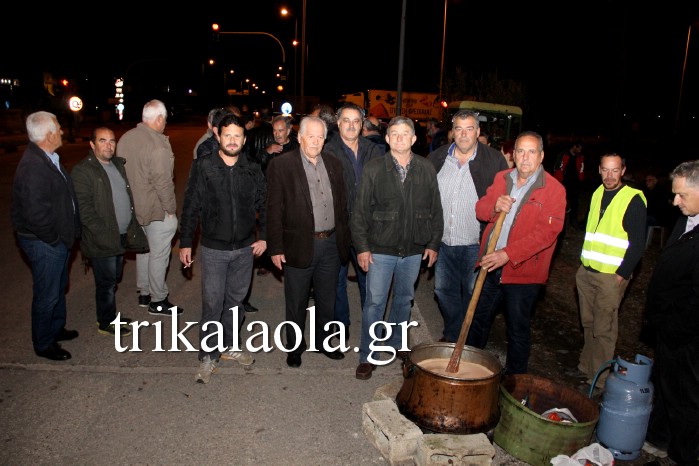 Χθες βράδυ, μέσα στην τέντα που έχουν στήσει, μαγείρεψαν σε καζάνια ένα παραδοσιακό φαγητό της περιοχής, κοκκινιστη προβατίνα με μανέστρα για να φάνε όσοι συμμετέχουν στα μπλόκα αλλά και οι διερχόμενοι οδηγοί.