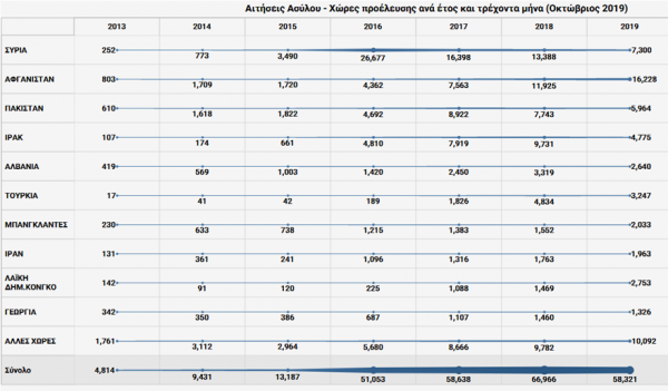 Από τους 9,767 αιτούντες άσυλο κατά το μήνα Οκτώβριο, οι 3,841 είναι υπήκοοι Αφγανιστάν, 1,849 από τη Συρία, 800 από το Πακιστάν, 489 από το Ιράκ, 337 Τούρκοι, 334 από το Μπαγκλαντές, 251 από τη και ακολουθούν υπήκοοι από την Αλβανία, Λαϊκή Δημοκρατία του Κονγκό, Ιράν, Σομαλία. Επιπλέον, τον Οκτώβριο κατατέθηκαν και 1.436 προσφυγές με υπηκόους Πακιστάν να βρίσκονται στην πρώτη θέση της σχετικής λίστας και να ακολουθούν Αλβανοί, Αφγανοί, Μπαγκλαντεσιανοί και Ιρακινοί.