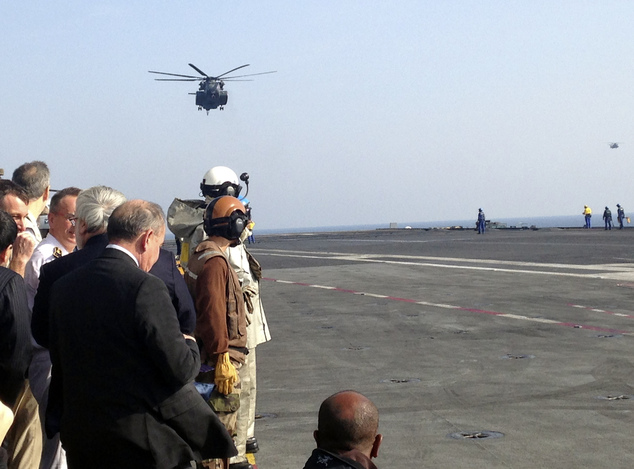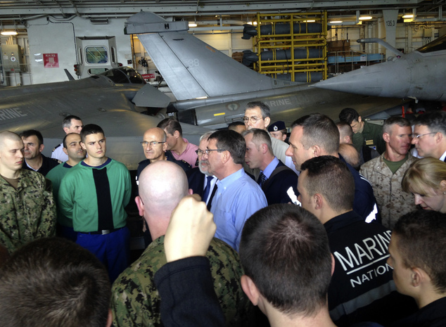 Κατά τη διάρκεια της επίσκεψής του στο αεροπλανοφόρο, ο Αμερικανός υπουργός συνομίλησε τηλεφωνικά με τον υπουργό Άμυνας της Γαλλίας Ζαν Ιβ Λε Ντριάν.