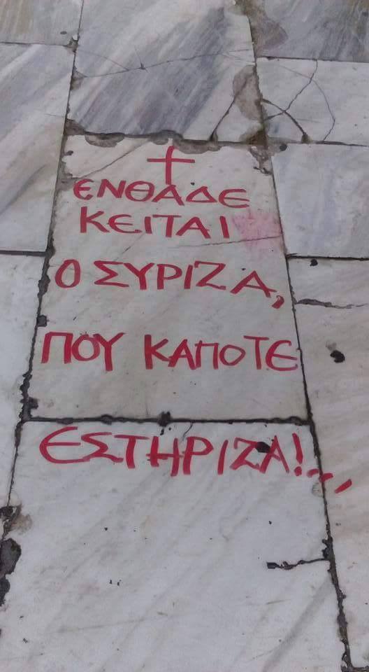 Κάποιος ή κάποιοι από αυτούς μάλιστα έσπευσαν να κάνουν την κηδεία του κόμματος που υποστηρίζουν στο Σύνταγμα. Αυτό τουλάχιστον φαίνεται από τη φωτογραφία που ανέβασε χρήστης στο twitter. Στην εικόνα φαίνεται πως κάποιος -προφανώς ψηφοφόρος του ΣΥΡΙΖΑ- έγραψε στα μάρμαρα της πλατείας Συντάγματος «+ ΕΝΘΑΔΕ ΚΕΙΤΑΙ Ο ΣΥΡΙΖΑ ΠΟΥ ΚΑΠΟΤΕ ΕΣΤΗΡΙΖΑ!…»
