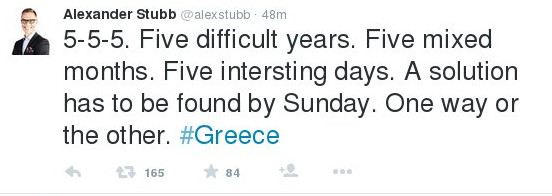 Ο Φινλανδός υπουργός Οικονομικών τόνισε σε ανάρτηση του ότι το 5 είναι κοινή συνισταμένη καθώς είναι 5 χρόνια μνημονίων, 5 μήνες διαπραγμάτευσης με τη νέα κυβέρνηση και 5 κρίσιμες ημέρες μέχρι και την Κυριακή.