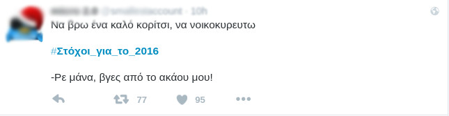 Παρομονή Χριστουγέννων και όλοι έχουν μπει στο κλίμα των γιορτών. Μεταξύ άλλων και το Twitter που από χθες, μέσω του hashtag #Στόχοι_για_το_2016 έχει αρχίσει να βάζει τους δικούς του στόχους για το νέο έτος. Με πολύ χιούμορ όπως πάντα.