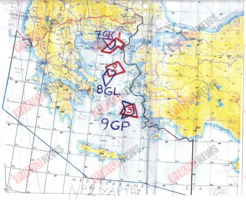 Χάρτης όπου απεικονίζονται τρεις περιοχές ελληνικής άσκησης (7-GK, 8-GL και 9-GP) με μπλε χρώμα στο χάρτη και οποίες επικαλύπτουν τρεις παράνομες τουρκικές περιοχές. Η Τουρκία ζητά οι ελληνικές περιοχές να τροποποιηθούν!