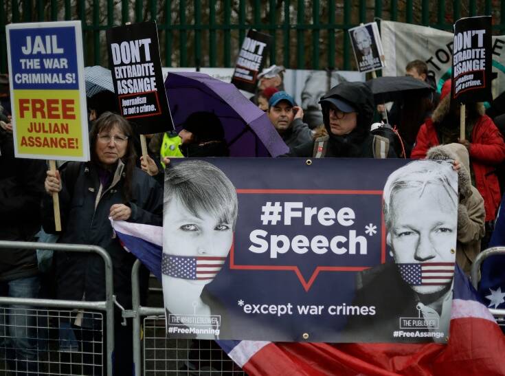 Δεκάδες άνθρωποι συμπαραστάθηκαν στον κατηγορούμενο ιδρυτή του ιστότοπου WikiLeaks φωνάζοντας. όπως μεταδίδει το ΑΠΕ – ΜΠΕ, συνθήματα όπως «απελευθερώστε τον Τζούλιαν Ασάνζ», «φυλακίστε τους εγκληματίες πολέμου», «μην πυροβολείτε τον αγγελιοφόρο» και «μην εκδώσετε τον Ασάνζ: η δημοσιογραφία δεν είναι έγκλημα».