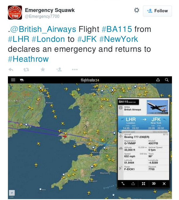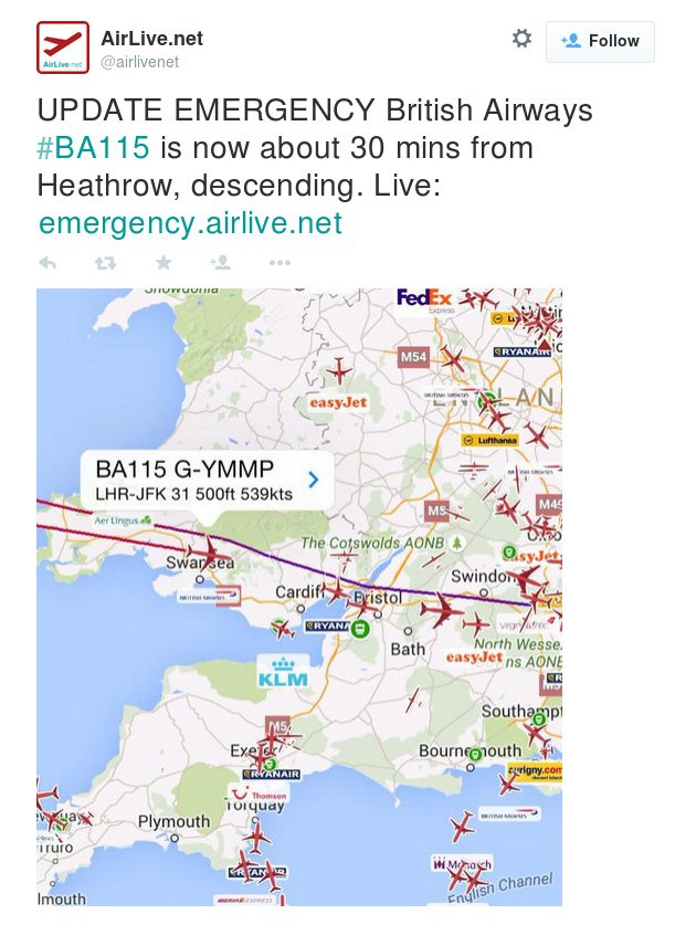 Εκτακτη ανάγκη επικαλέστηκε ο πιλότος της πτήσης BA115 που ξεκίνησε από το Χίθροοου, του Λονδίνου, με προορισμό το αεροδρόμιο JFK της Νέας Υόρκης.