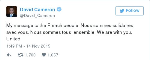 «Οι επιθέσεις ήταν φρικτές και αρρωστημένες. Θα πρέπει να είμαστε προετοιμασμένη για βρετανικές απώλειες», είπε ο Κάμερον μετά από τη σύσκεψη με την COBRA, την ομάδα αντιμετώπισης κρίσεων. «Είμαστε μαζί σας, είμαστε ενωμένοι», ήταν το μήνυμα του Βρετανού πρωθυπουργού στο γαλλικό λαό, κάνοντας την ίδια ανάρτηση στο Twitter και στα γαλλικά.