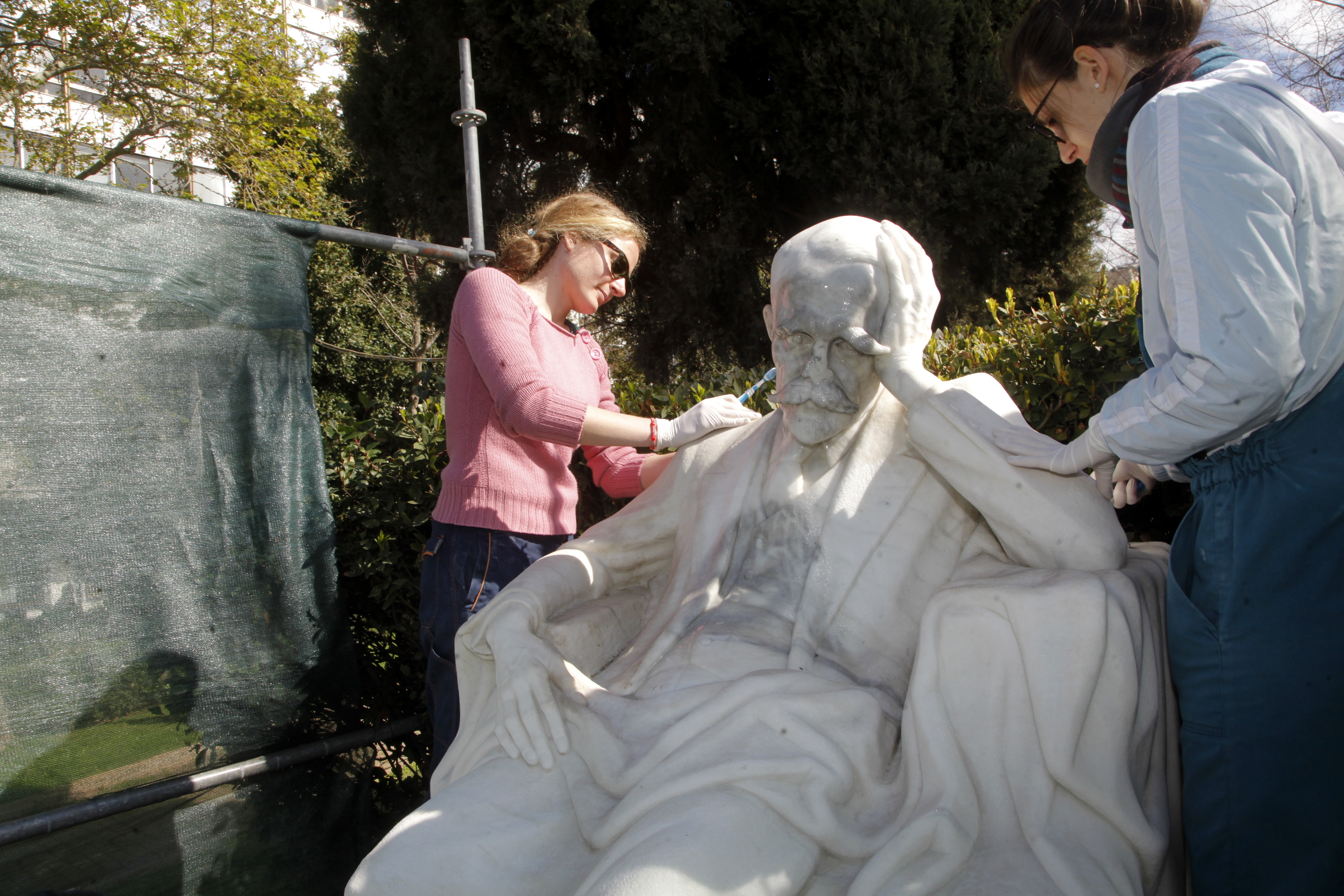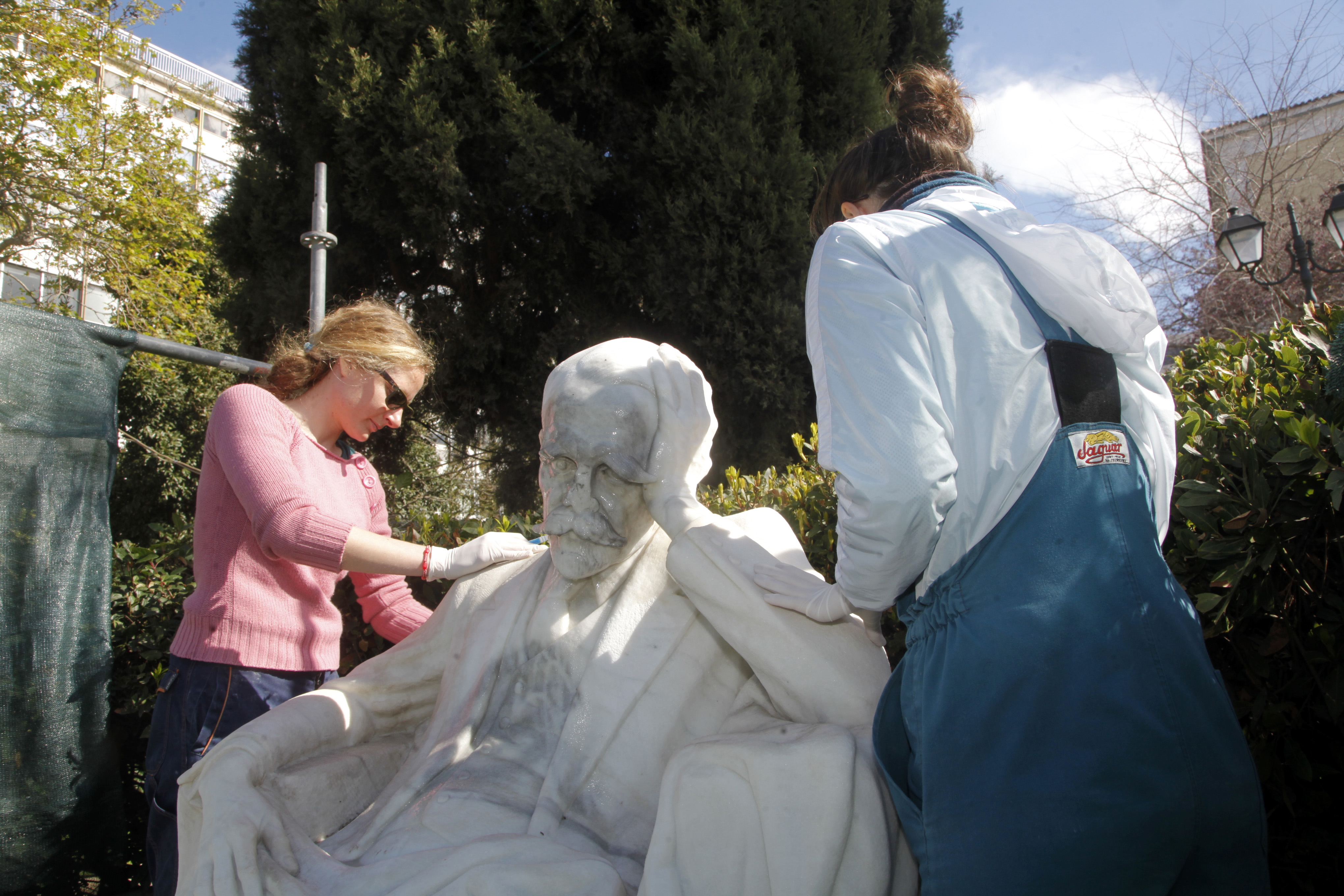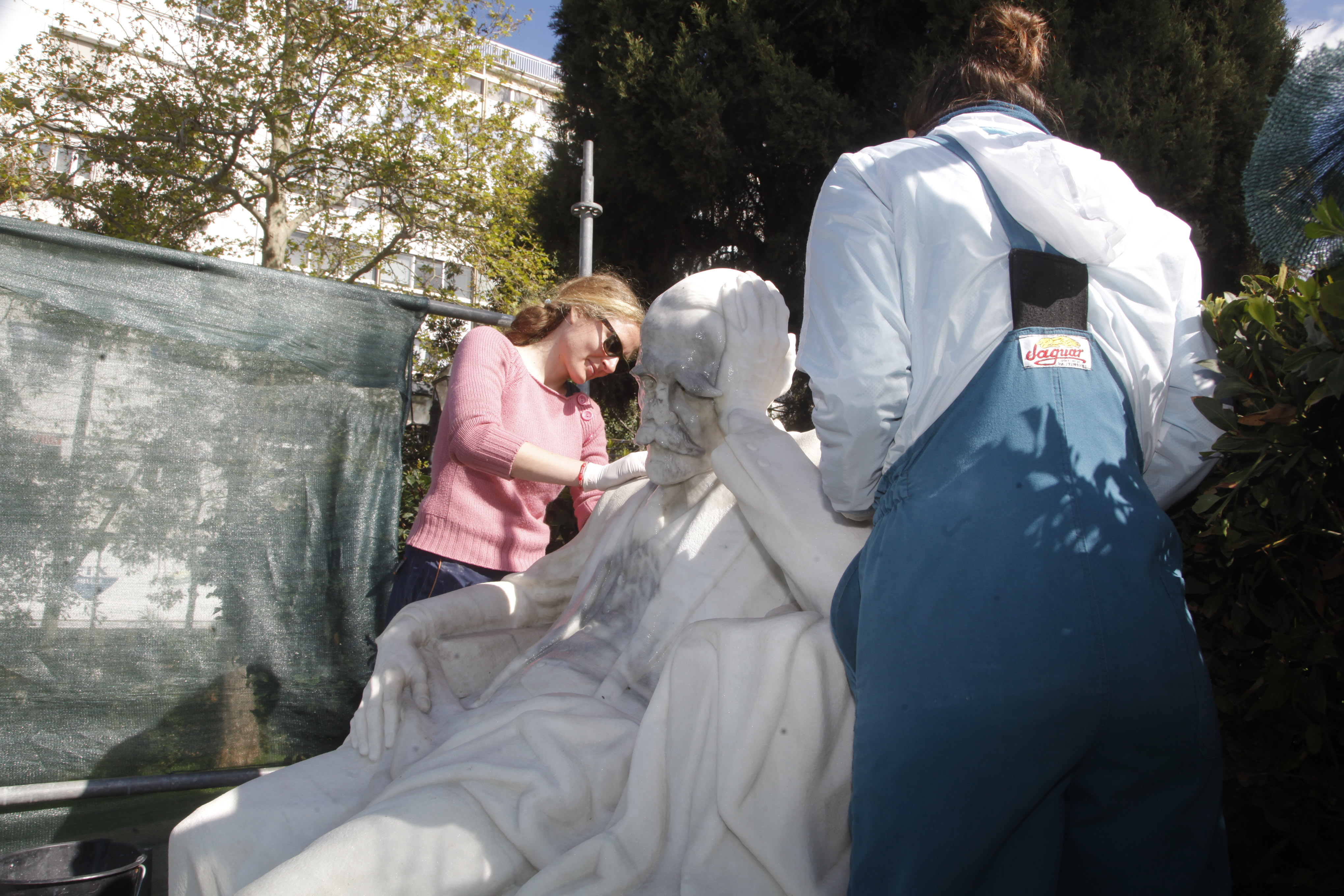 Τις «περιποιήσεις» των ειδικών συνεργείων καθαρισμού δέχονται από το πρωί της Τρίτης τα αγάλματα που κατέστρεψαν οι καταληψίες της Νομικής.