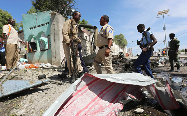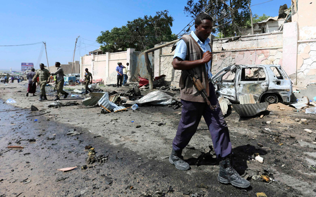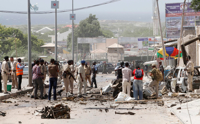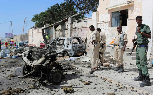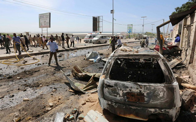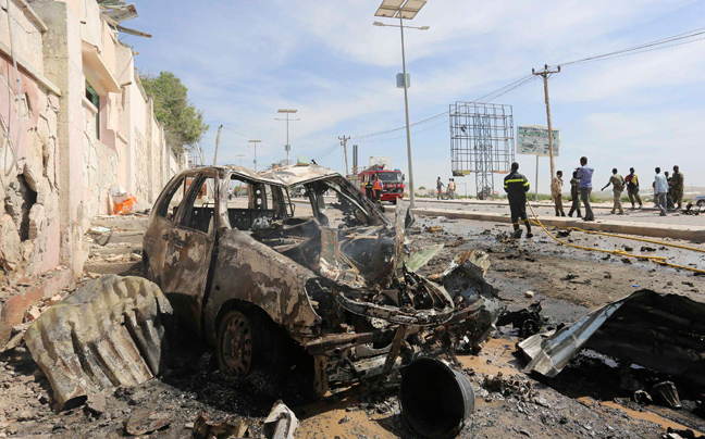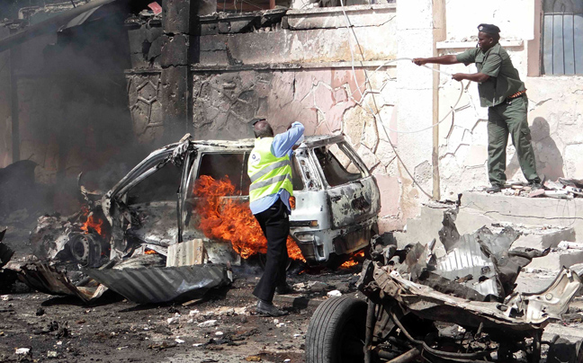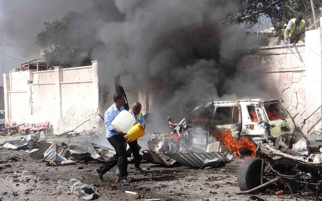 Καμμένα οχήματα, συντρίμμια, καπνοί και απεγνωσμένοι Σομαλοί που προσπαθήσουν να σβήσουν τη φωτιά μετά την έκρηξη παγιδευμένου αυτοκινήτου, συνθέτουν το σκηνικό μπροστά από την είσοδο του αεροδρομίου του Μογκαντίσου.