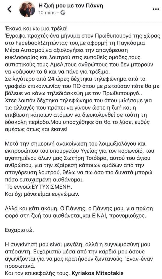 Με τη Άδα Σταματάτου, τη μητέρα που κρύβεται πίσω από τη σελίδα στο Facebook «Η ζωή μου με τον Γιάννη», στην οποία διηγείται και περιγράφει πώς είναι η καθημερινότητα για μια μητέρα με ένα παιδί με αυτισμό, επικοινώνησε ο πρωθυπουργός Κυριάκος Μητσοτάκης με αφορμή επιστολή που του απέστειλε για την απαγόρευση κυκλοφορίας.
