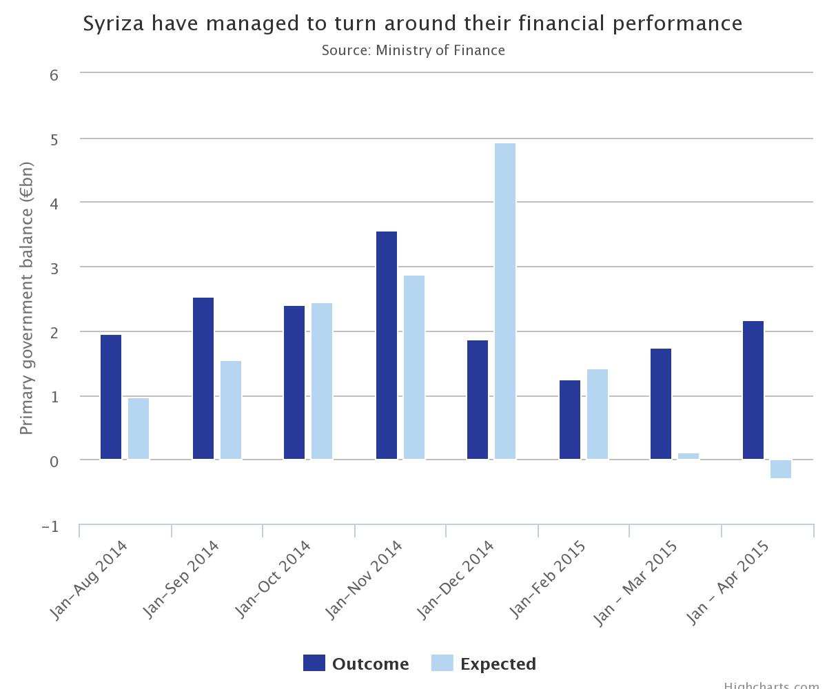 Η Ελλάδα έχει να παρουσιάσει έσοδα της τάξης των 15,82 δισεκατομμυρίων ευρώ, αριθμός που ξεπέρασε τις αρχικές προσδοκίες, ενώ οι δαπάνες έπεσαν κατά δύο δισεκατομμύρια ευρώ από τον αρχικό στόχο.