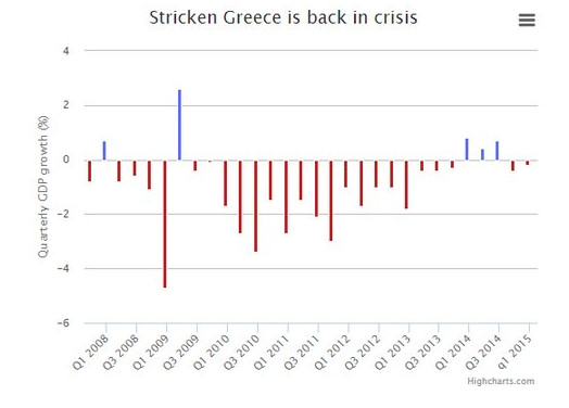 Από την άλλη, σύμφωνα με τα επίσημα στοιχεία, η Ελλάδα έχει επιστρέψει για τα καλά στην ύφεση. «Η εκλογή της αριστερής κυβέρνησης έχει αναφερθεί ευρέως ως ο κύριος λόγος που η οικονομία της χώρας έχει βυθιστεί ξανά σε μια αναταραχή. Οι Ευρωπαίοι πιστωτές – και κυρίως το Βερολίνο – σημειώνουν πως η χώρα κατάφερε πέρυσι να επιστρέψει στην ανάπτυξη, έπειτα από επτά χρόνια ύφεσης. Τώρα, όμως, αυτή η εκκολαπτόμενη ανάπτυξη βρίσκεται σε κίνδυνο από την αποφασιστικότητα του ΣΥΡΙΖΑ να διαγράψει τους όρους της σύμβασης λιτότητας», αναφέρει το άρθρο.