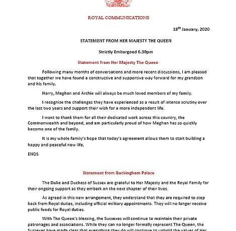 «Δεν θα λαμβάνουν πλέον δημόσια κονδύλια για βασιλικά καθήκοντα», ανέφερε ακόμη η ανακοίνωση. «Με την ευλογία της βασίλισσας, οι Susσeξes θα συνεχίσουν να κάνουν τις ιδιωτικές τους υποχρεώσεις. Καθώς δεν μπορούν πλέον να εκπροσωπούν τυπικά τη Βασίλισσα, οι Susσeξes έχουν καταστήσει σαφές ότι με όλα όσα κάνουν θα συνεχίσουν να υποστηρίζουν τις αξίες της Αυτού Μεγαλειότητας. Οι Susσeξes δεν θα χρησιμοποιήσουν τους τίτλους HRH τους, επειδή δεν εργάζονται πλέον ως μέλη της Βασιλικής Οικογένειας».