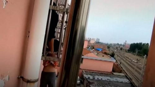 Τα πλάνα που τραβήχτηκαν κατά τη διάρκεια της επιχείρησης στην Κίνα δείχνουν το παιδί να κρέμεται από τον τέταρτο όροφο πολυκατοικίας στην Linyi City.