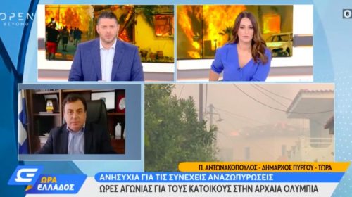 «Όλη η Ηλεία έχει καλυφθεί από καπνό, στον Πύργο η ορατότητα είναι περιορισμένη, η φωτιά στην Αρχαία Ολυμπία καίει σε μεγάλη έκταση και το έργο της κατάσβεσης είναι δύσκολο» τόνισε ο Δήμαρχος Πύργου Παναγιώτης Αντωνακόπουλος, μιλώντας στο OPEN, λέγοντας πως απειλούνται και οικισμοί.