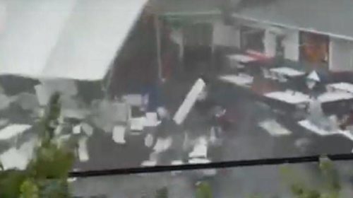 Σύμφωνα με βίντεο που έδειξε ο Alpha δύο άνθρωποι τραυματίστηκαν όταν η προσωρινή τέντα που προσπαθούσαν να τοποθετήσουν σηκώθηκε από τον ισχυρό άνεμο.