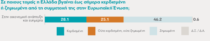 - Το 46,2% των πολιτών πιστεύουν πως η Ελλάδα βγήκε ζημιωμένη από τη συμμετοχή της στην Ευρωπαϊκή Ένωση στα θέματα της οικονομίας και της ανάπτυξης.