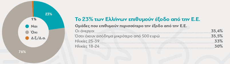 Την έξοδο της Ελλάδας από την Ε.Ε. επιθυμεί μεγάλο ποσοστό ανέργων και ατόμων με χαμηλά εισοδήματα ενώ ένας στους δυο Έλληνες θεωρεί ότι η Ελλάδα είναι ζημιωμένη από τη συμμετοχή της στην Ένωση.