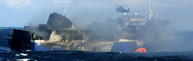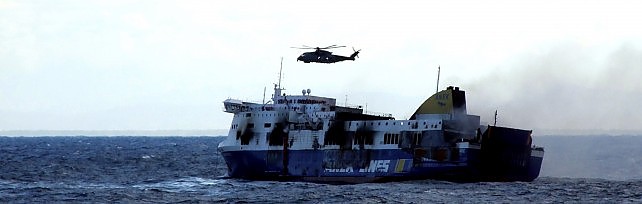 Από τα ξημερώματα της Κυριακής το «Norman Atlantic» φλέγεται με αποτέλεσμα να έχει καεί το μεγαλύτερο μέρος του και να δείχνει μια εικόνα ενός κατεστραμμένου πλοίου.