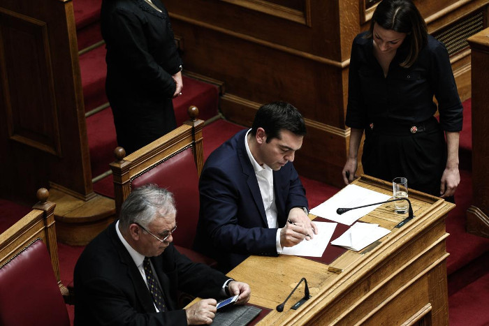 Στην πρώτη σειρά των υπουργικών εδράνων και δίπλα από τον πρωθυπουργό Αλέξη Τσίπρα πήραν θέσεις, κατά σειρά, ο αντιπρόεδρος της κυβέρνησης Γιάννης Δραγασάκης, ο υπουργός Υγείας και Κοινωνικών Ασφαλίσεων Παναγιώτης Κουρουμπλής, ο υπουργός Οικονομίας, Υποδομών, Ναυτιλίας και Τουρισμού Γιώργος Σταθάκης, ο υπουργός Επικρατείας Νίκος Παππάς, ο υπουργός Εργασίας Πάνος Σκουρλέτης, ο αναπληρωτής υπουργός Οικονομικών Δημήτρης Μάρδας, ο κυβερνητικός εκπρόσωπος Γαβριήλ Σακελλαρίδης και η αναπληρωτής υπουργός Τουρισμού Έλενα Κουντουρά, που ήταν και η μοναδική από τους Ανεξάρτητους Έλληνες που επέλεξε να καθίσει στα υπουργικά έδρανα.