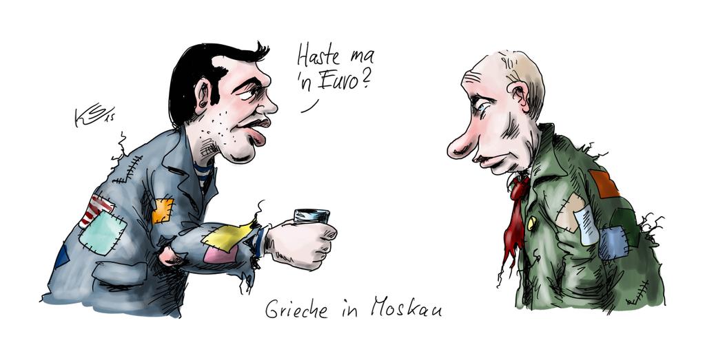 Ενα άκρως ειρωνικό σκίτσο φιλοξενεί το Tagesspiegel με αφορμή την επίσκεψη του Αλέξη Τσίπρα στη Μόσχα και την συνάντησή του αύριο Τετάρτη με τον Βλαντιμίρ Πούτιν.