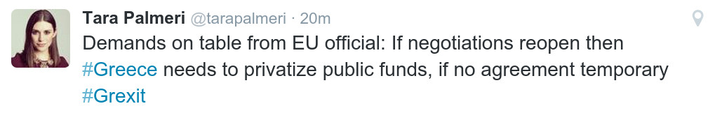 Λίγο αργότερα ξανατούιταρε: «Απαιτήσεις στο τραπέζι από αξιωματούχο της ΕΕ: Αν οι διαπραγματεύσεις ξαναξεκινήσουν η Ελλάδα θα χρειαστεί να ιδιωτικοποιήσει δημόσια περιουσία, αν δεν υπάρξει συμφωνία προσωρινό Grexit».
