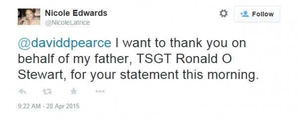 Συγκεκριμένα, έγραψε: «Θέλω να σας ευχαριστήσω εκ μέρους του πατέρα μου, λοχία Ρόναλντ Ο. Στιούαρτ για τη δήλωσή σας σήμερα το πρωί», ενώ ανάρτησε και όλες τις δηλώσεις του πρέσβη.