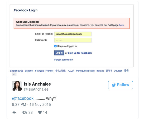 Η μηχανικός Isis Anchalee από το Σαν Φρανσίσκο των ΗΠΑ βρήκε χθες τον προσωπικό της λογαριασμό στο Facebook μπλοκαρισμένο από την γνωστή ιστοσελίδα κοινωνικής δικτύωσης.