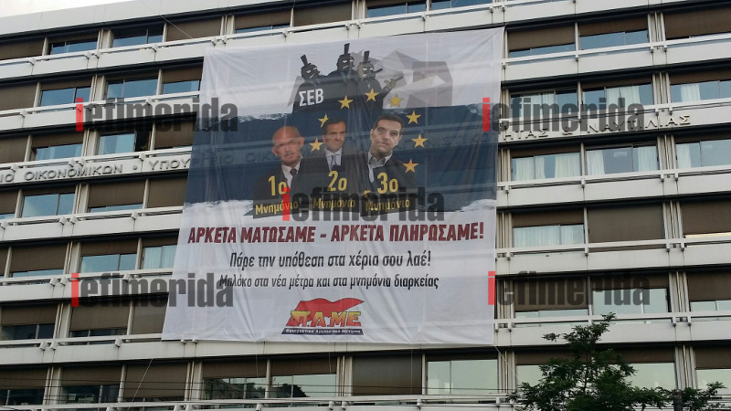 Οπως αναφέρουν σε ανακοίνωσή τους, «αυτή τη στιγμή, εργαζόμενοι από δεκάδες σωματεία του Ιδιωτικού και του Δημόσιου τομέα που συσπειρώνονται στο ΠΑΜΕ, πραγματοποιούν κινητοποίηση στο Υπουργείο Οικονομικών έχοντας απλώσει ένα τεράστιο πανό στην πρόσοψη του κτιρίου με σύνθημα: “Αρκετά ματώσαμε, αρκετά πληρώσαμε! Πάρε την υπόθεση στα χέρια σου λαέ! Μπλόκο στα νέα μέτρα και στα μνημόνια διαρκείας”.