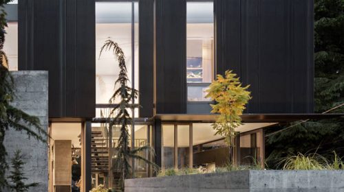 Εσωτερικά, η χρωματική παλέτα του μπετόν, του ξύλου και των σκούρων υλικών συνταιριάζεται με τη μοντέρνα επίπλωση, δημιουργώντας μια κομψή και φιλόξενη ατμόσφαιρα που πατά και στους δύο κόσμους απ’ όπου αντλεί έμπνευση, και στην πόλη και στο ύπαιθρο δηλαδή.