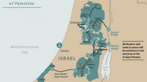 Ο χάρτης εμφανίζει εδάφη υπό παλαιστινιακό έλεγχο σε κάποιες περιοχές της Δυτικής Όχθης, που θα είναι όμως πλήρως περικυκλωμένα από το Ισραήλ, με οδικές προσβάσεις στην Ιορδανία.