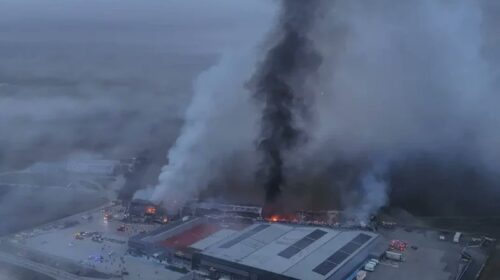 Το drone πετάει πάνω από τις εγκαταστάσεις και καταγράφει την απόλυτη καταστροφή. Πυκνοί μαύροι καπνοί έχουν σκεπάσει τον ουρανό, ενώ φαίνεται καθαρά πως μια ολόκληρη πτέρυγα του εργοστασίου έχει γίνει στάχτη και συντρίμμια. Είναι το σημείο όπου εκτυλίχθηκε η τραγωδία, εκεί που τουλάχιστον τρεις γυναίκες πήγαν για το μεροκάματο και δεν γύρισαν ποτέ πίσω.