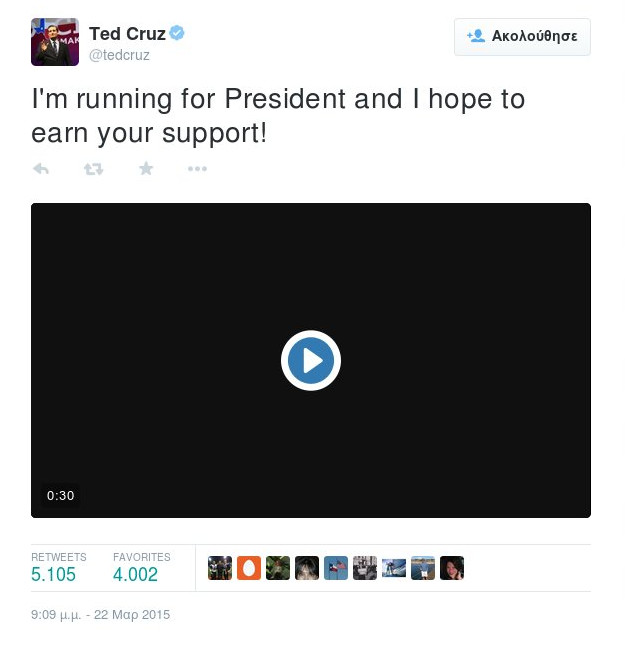 «Είμαι υποψήφιος για την προεδρία και ελπίζω πως θα κερδίσω την υποστήριξή σας!», έγραψε ο Κρουζ στην επίσημη σελίδα του στο Twitter, ένα μάλλον ασυνήθιστο φόρουμ για την ανακοίνωση τέτοιων σχεδίων από υποψηφίους για την προεδρία.