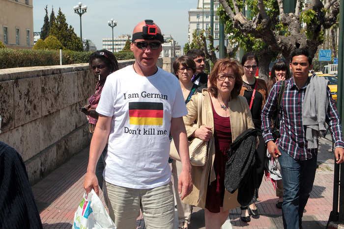 Ωστόσο, υπάρχουν και Γερμανοί πολίτες που αγαπούν την Ελλάδα. Και δεν είναι λίγοι. Ενας εξ’ αυτών μάλιστα βρέθηκε σήμερα έξω από την ελληνική Βουλή. Με σημαία της πατρίδας του στο μπλουζάκι του και την φράση «Είμαι Γερμανός, μην με σκοτώσετε» έστειλε το μήνυμα του ότι είναι «φίλος» της χώρας μας.