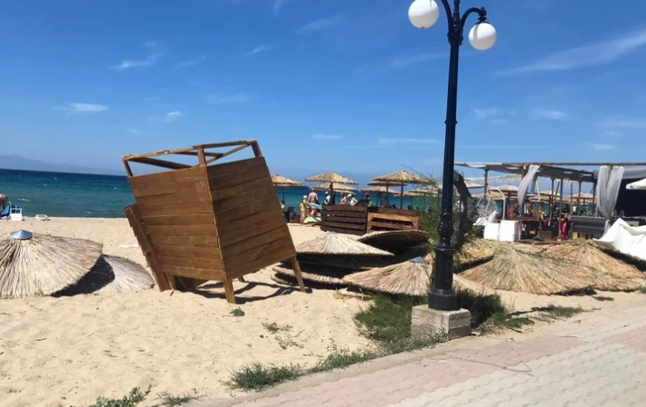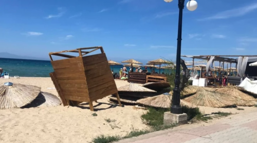 Ο ισχυρός άνεμος ξερίζωσε ομπρέλες, αναποδογύρισε ξαπλώστρες και προκάλεσε φθορές σε παρακείμενο beach bar, αναφέρει το seleo.gr.