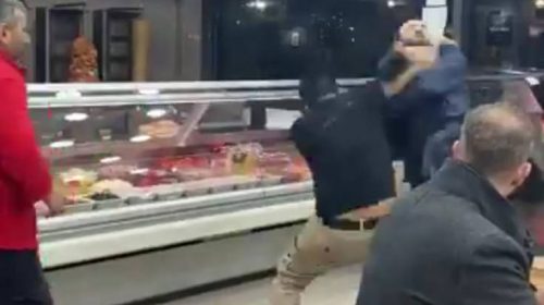 Ένας νεαρός με γκρι μπλουζάκι και μπλε καπέλο φαίνεται στο βίντεο να χτυπά έναν υπάλληλο, που απαντά ρίχνοντάς του ένα ζευγάρι λαβίδες. Άλλος επιθετικός πελάτης μπαίνει στον καβγά και τέσσερις υπάλληλοι παρεμβαίνουν με τις κλωτσιές να δίνουν και να παίρνουν.