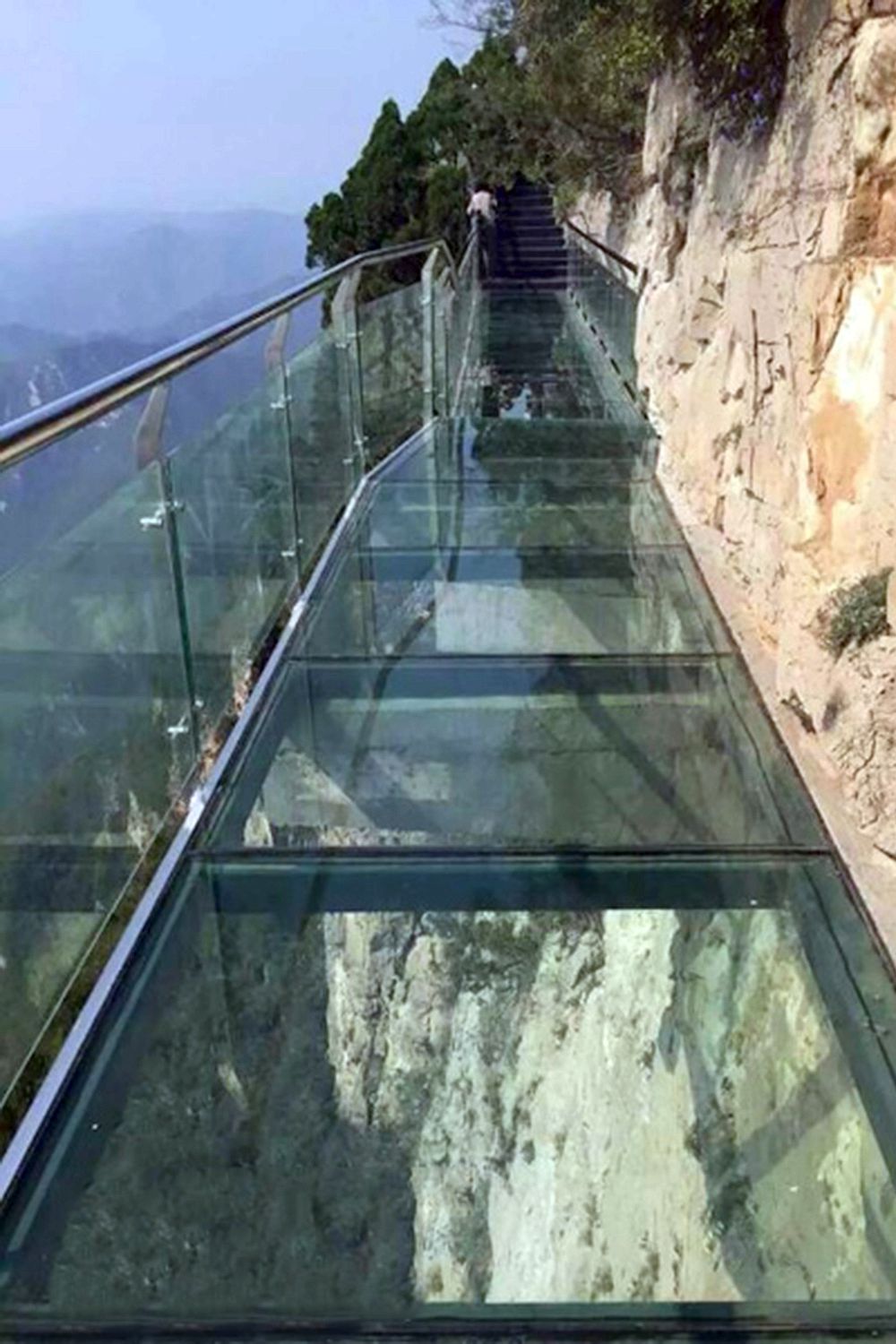 Ένας Κινέζος τουρίστας έζησε τον απόλυτο τρόμο όταν το γυαλί πάνω στο οποίο βρισκόταν σε ένα γυάλινο μονοπάτι 3.500 πόδια (1.066 μέτρα) πάνω από το έδαφος ράγισε.