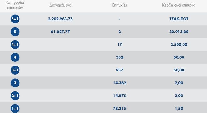 Οι τυχεροί αριθμοί είναι οι 1, 10, 26, 27, 42 και τζόκερ το 7. Στη δεύτερη κατηγορία (5 επιτυχίες) βρέθηκαν δύο τυχεροί, οι οποίοι θα πάρουν από σχεδόν 31.000 ευρώ.