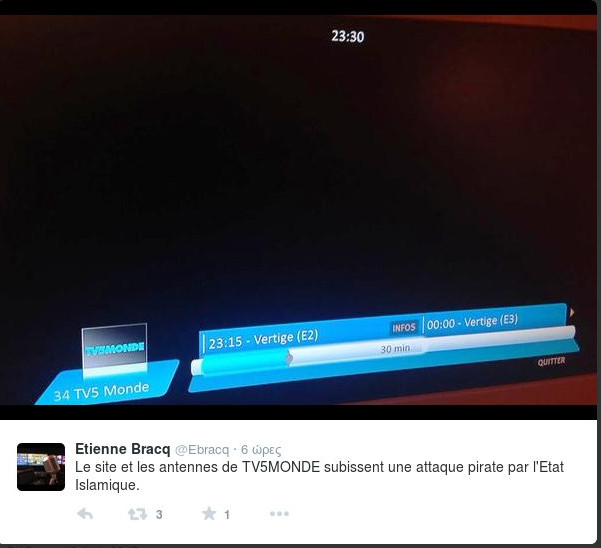 Το site και οι κεραίες του TV5 Monde δέχθηκαν πειρατική επίθεση από το Ισλαμικό Κράτος γράφει ο Ετιέν Μπρακ