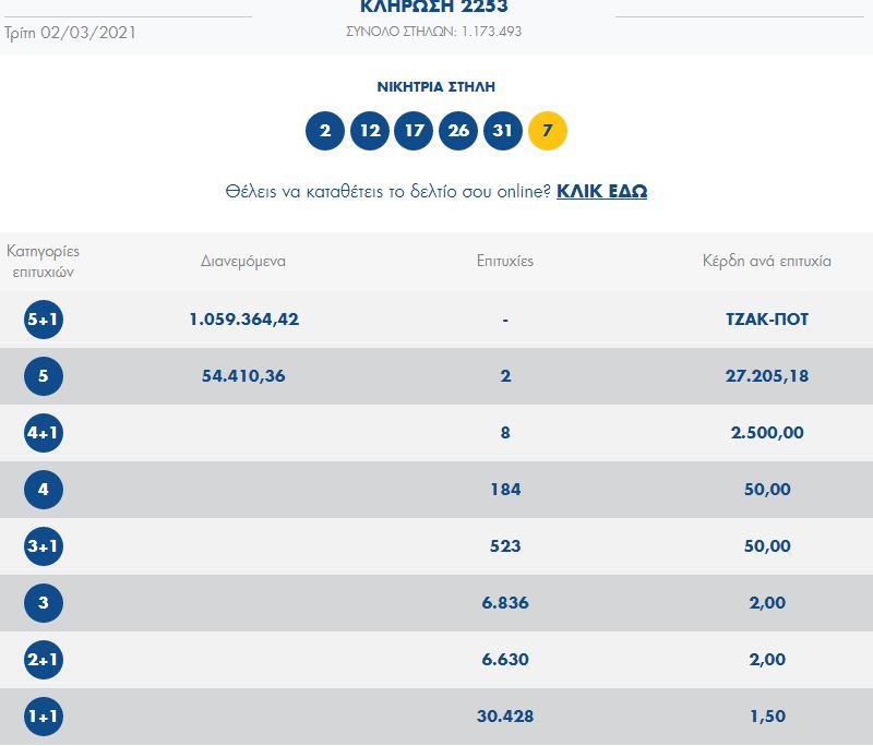 Οι τυχεροί αριθμοί που έβγαλε η κληρωτίδα είναι οι: 2, 12, 17, 26, 31 και Τζόκερ ο αριθμός 7 .