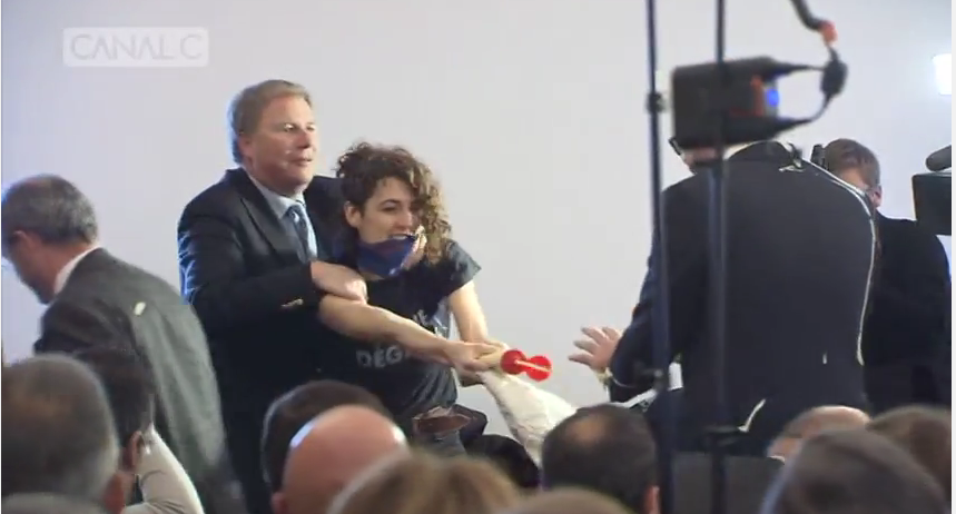 Οι γυναίκες υποστηρίζουν ότι είναι μέλη των Femen. Οι άνδρες της προσωπικής ασφάλειας του 39χρονου Μισέλ ακινητοποίησαν την μία εξ αυτών αρχικά και στη συνέχεια απομάκρυναν και τις υπόλοιπες. O νεότερος βουλευτής του Βελγίου, αφού καθαρίστηκε, επέστρεψε για να συνεχίσει την ομιλία του αν και χωρίς σακάκι.