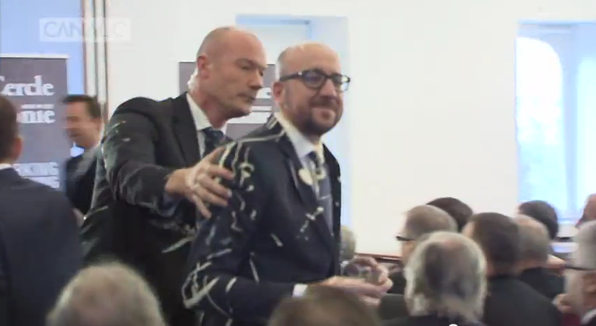 Ο βουλευτής Τσάρλς Μισέλ, την ώρα που μιλούσε στην Ναμούρ της δυτικής Βαλλονίας, υπέστη την επίθεση από τέσσερις γυναίκες οι οποίες του έριξαν μαγιονέζα και πατάτες τηγανητές φωνάζοντας «απάλλαξέ μας από την λιτότητα».