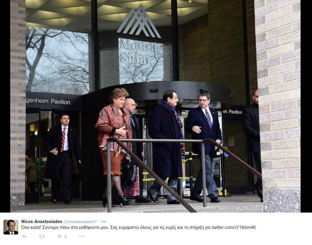 Ηδη ο πρόεδρος της Κυπριακής Δημοκρατίας ανέβασε μια φωτογραφία στο λογαριασμό του στο Twitter από τη στιγμή που εξέρχεται του νοσοκομείου γράφοντας τα εξής: «Ολα καλά! Σύντομα πίσω στα καθήκοντα μου. Σας ευχαριστώ όλους για τις ευχές και τη στήριξη».