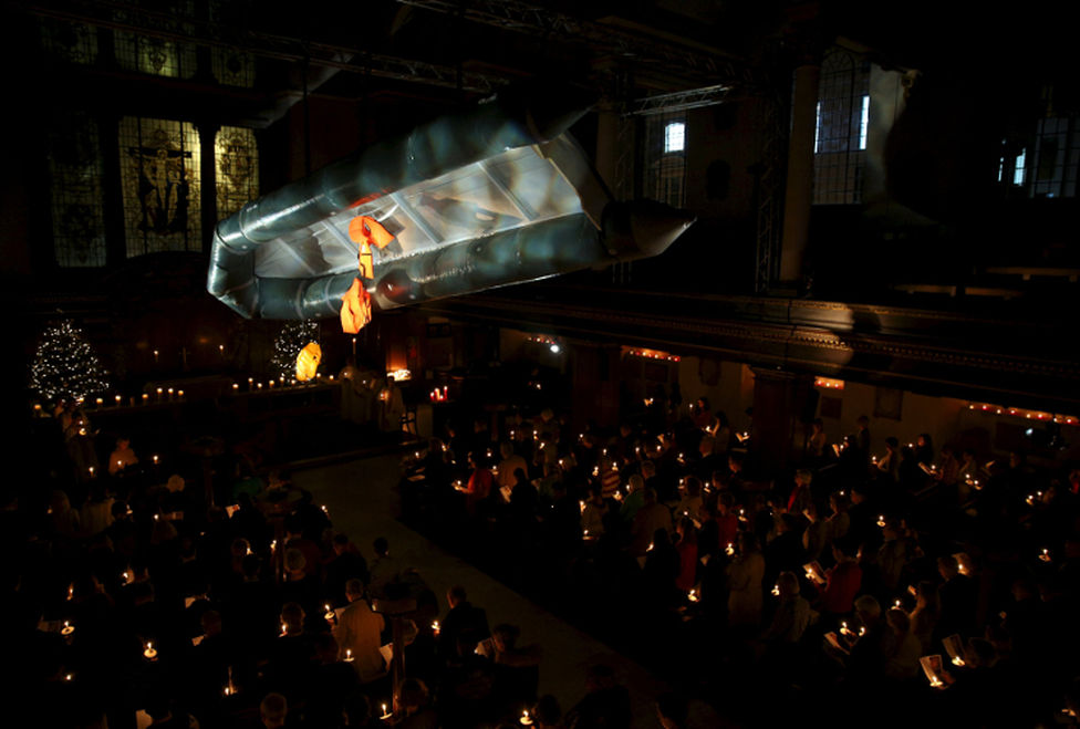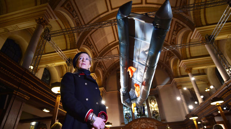 Το εργο της κρεμεται απο χθες πάνω από το κλίτος της εκκλησίας Σεντ Τζέιμς στο Πικαντίλι, σε μία από τις πλέον τουριστικές συνοικίες του Λονδίνου.