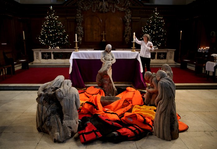 Εικαστικός από το Λονδίνο πήρε στα χέρια της μια φουσκωτή βάρκα, με την οποία πέρασαν πρόσφυγες στη Λέσβο και πορτοκαλί σωσίβια και παρουσίασε μία εικαστική εγκατάσταση, φόρο τιμής στους χιλιάδες πρόσφυγες.
